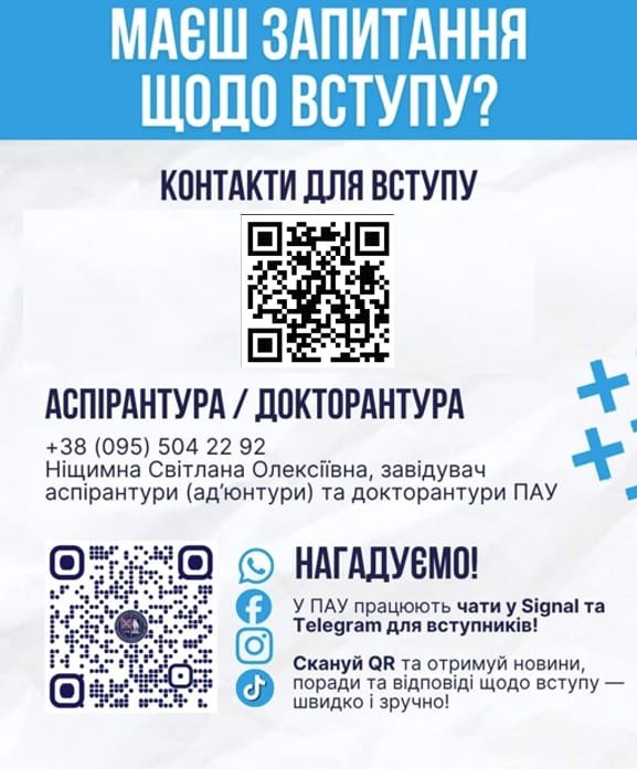 З питань вступу до докторантури – звертайтеся за зазначеним контактним телефоном (вступні іспити не передбачені).