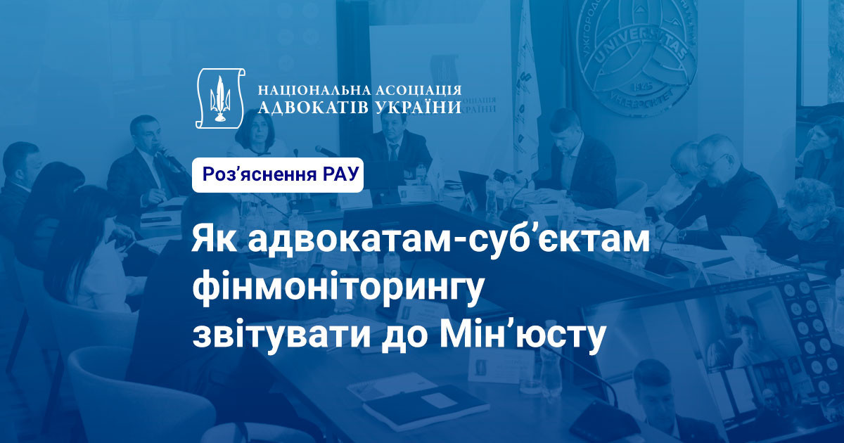 Рада адвокатів України під час засідання 15 грудня затвердила інформаційний лист про необхідність подання адвокатами, адвокатськими бюро та адвокатськими об’єднаннями (спеціально визначеними суб’єктами первинного фінансового моніторингу) до 11 числа після звітного періоду Звіту відповідним міжрегіональним управлінням Міністерства юстиції.